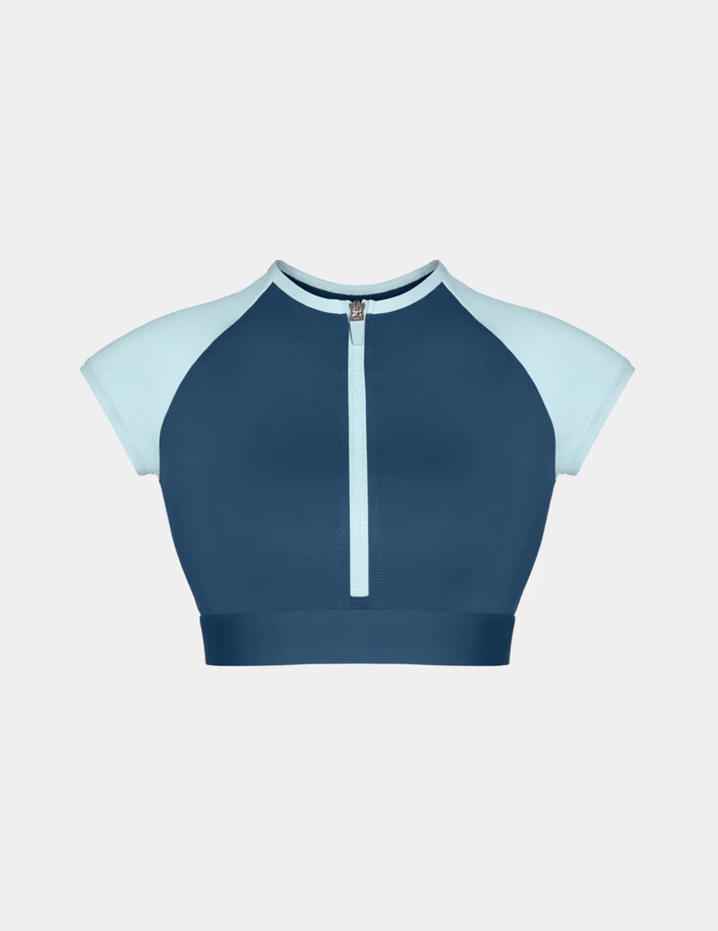 Sporty full-coverage swim top featuring a built-in shelf bra and front zipper.
