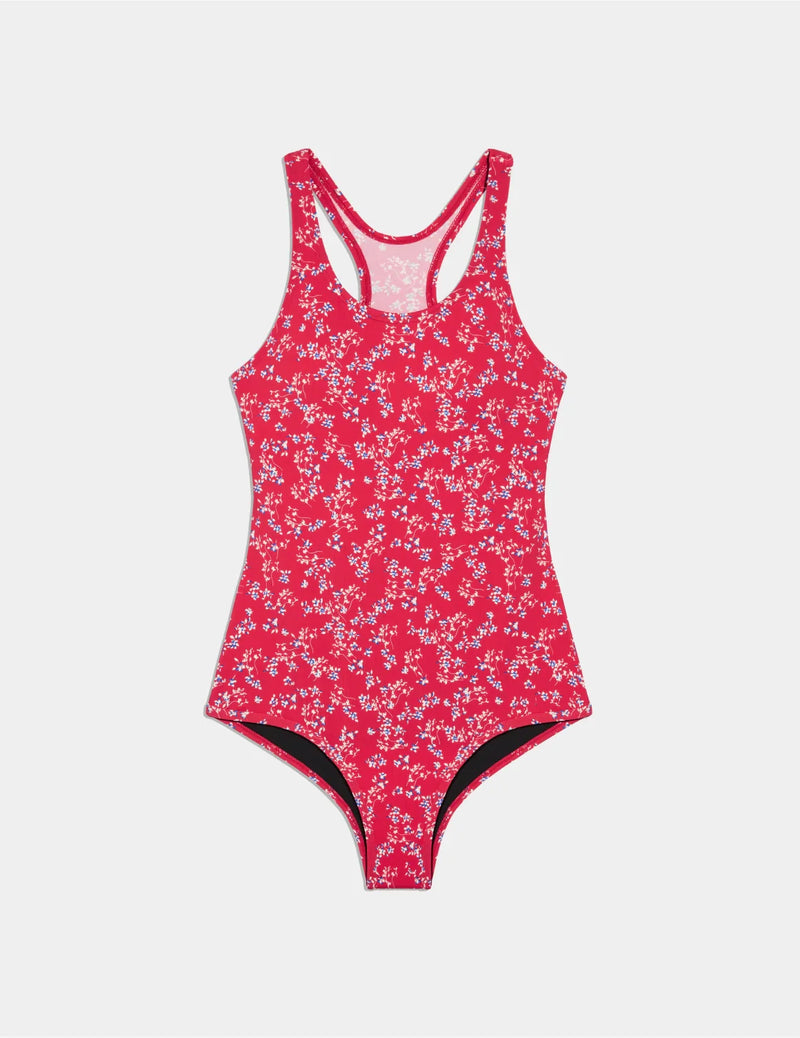 A sporty one-piece style featuring removable cups and an open racerback for added mobility.